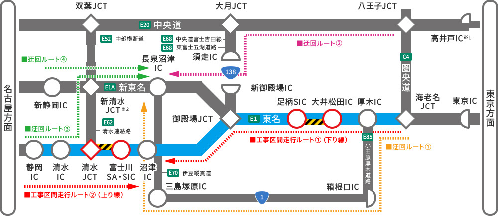 ※1 高井戸ICからは乗り入れできません。※2 新清水JCTから先もE1A新東名のご利用をご検討ください。