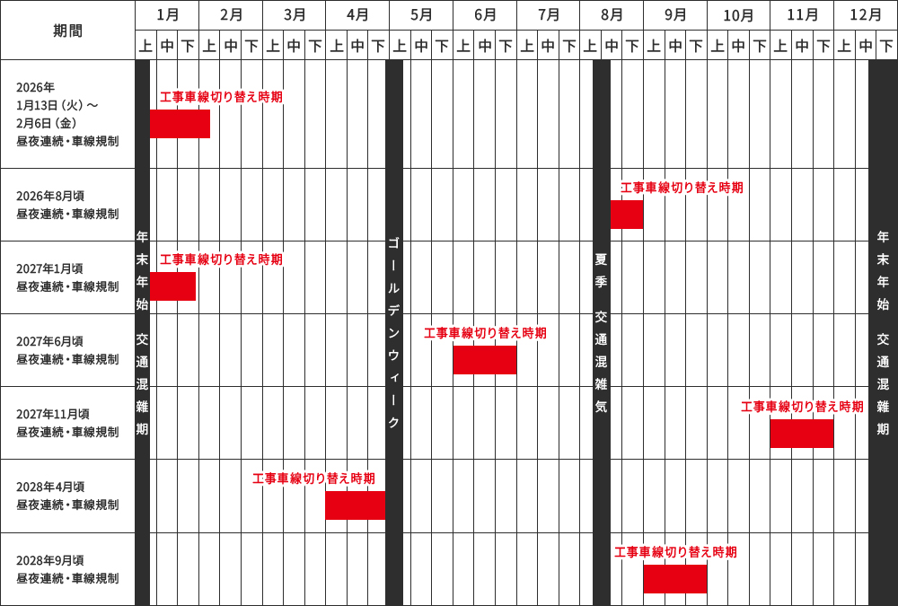 工事する車線の切り替えによって、走行可能な車線数を2車線から1車線へ規制するため、渋滞を予測していますので、迂回ルートや公共交通機関のご利用、お出かけ時間の変更のご検討をお願いします。