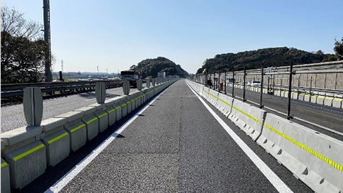 コンクリート製で剛性が高い防護ブロックを交通規制材に採用することで、昼夜連続・車線分離規制において対向車線への突破事故を防ぎます。
