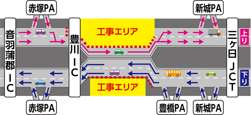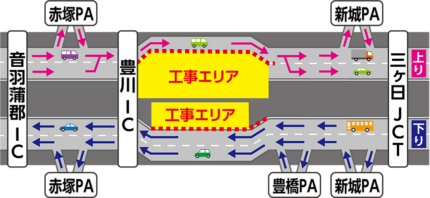 交通規制期間中も三ヶ日JCT、新城パーキングエリア(PA)、豊橋PA、豊川IC、赤塚PA、音羽蒲郡ICは通常どおりご利用いただけます。