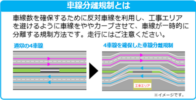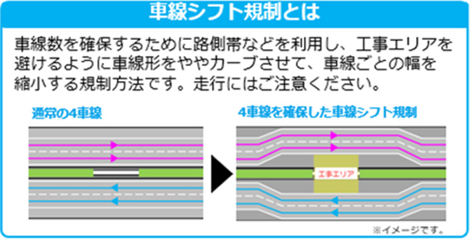上下線で車線規制、車線シフト規制、車線分離規制を