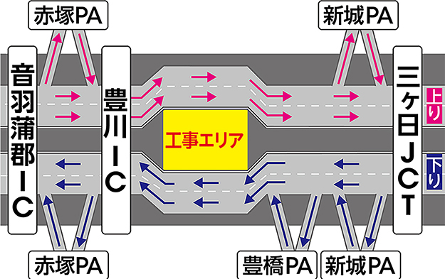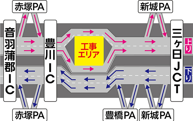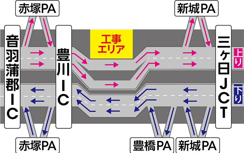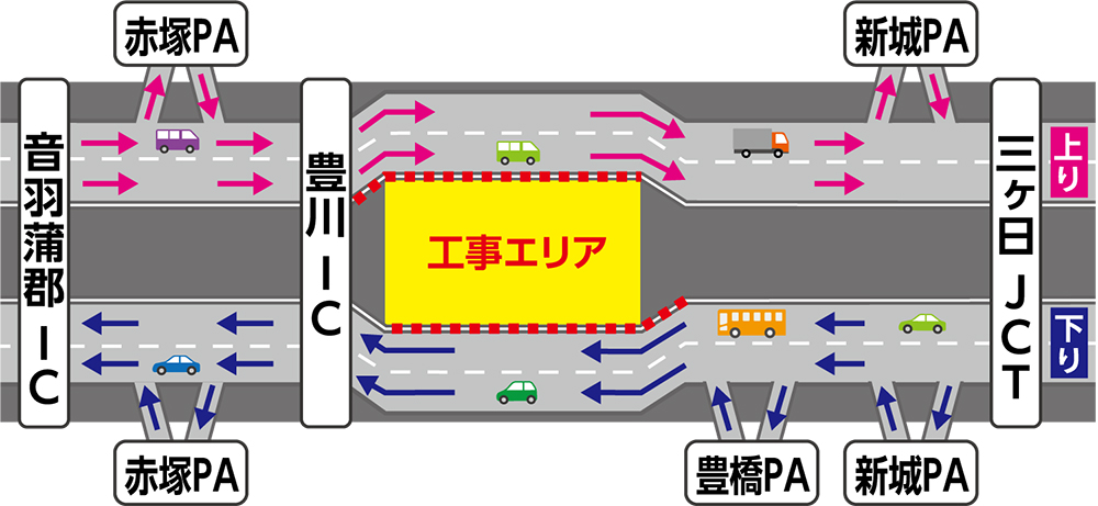 交通規制期間中も三ヶ日JCT、新城パーキングエリア(PA)、豊橋PA、豊川IC、赤塚PA、音羽蒲郡ICは通常どおりご利用いただけます。