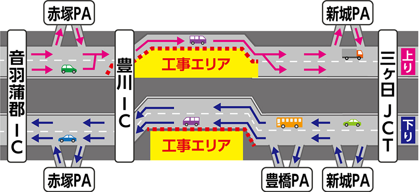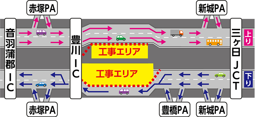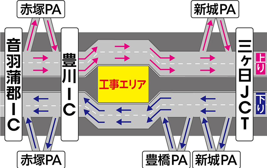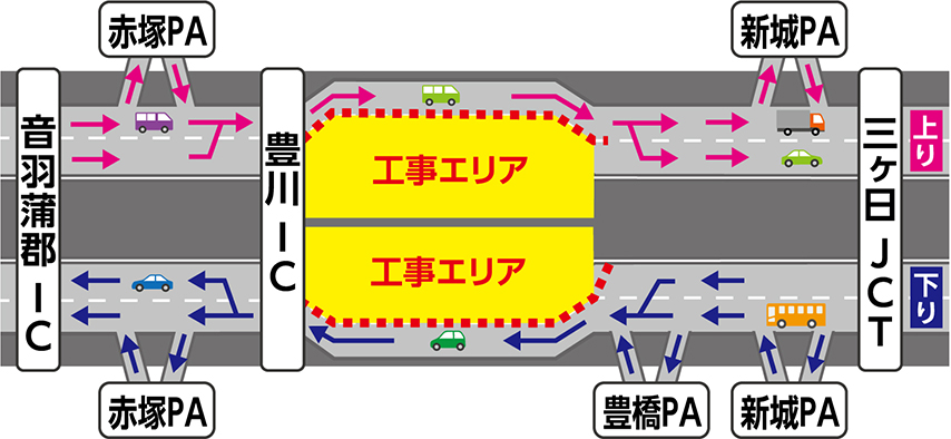 交通規制期間中も三ヶ日JCT、新城パーキングエリア(PA)、豊橋PA、豊川IC、赤塚PA、音羽蒲郡ICは通常どおりご利用いただけます。