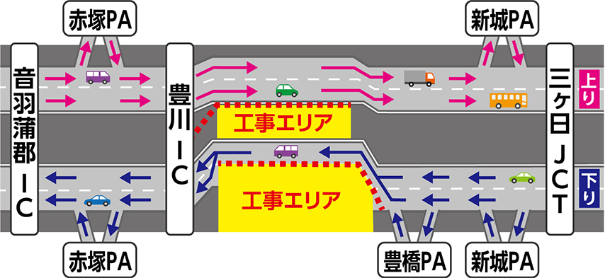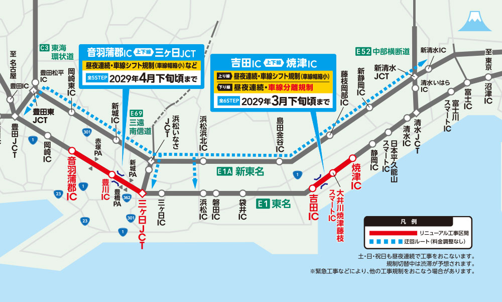 交通規制期間中も三ヶ日JCT、新城パーキングエリア(PA)、豊橋PA、豊川IC、赤塚PA、音羽蒲郡ICは通常どおりご利用いただけます。