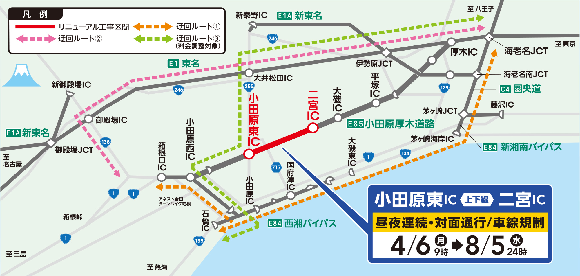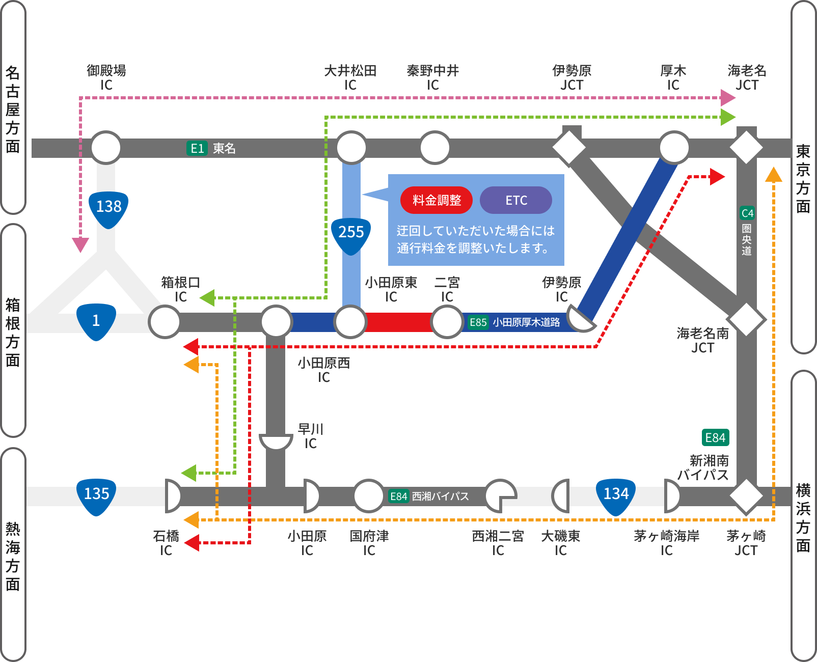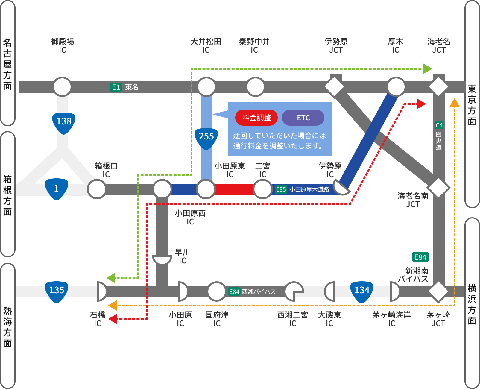 E84 西湘BP、E1 東名などのご利用をお願いします。