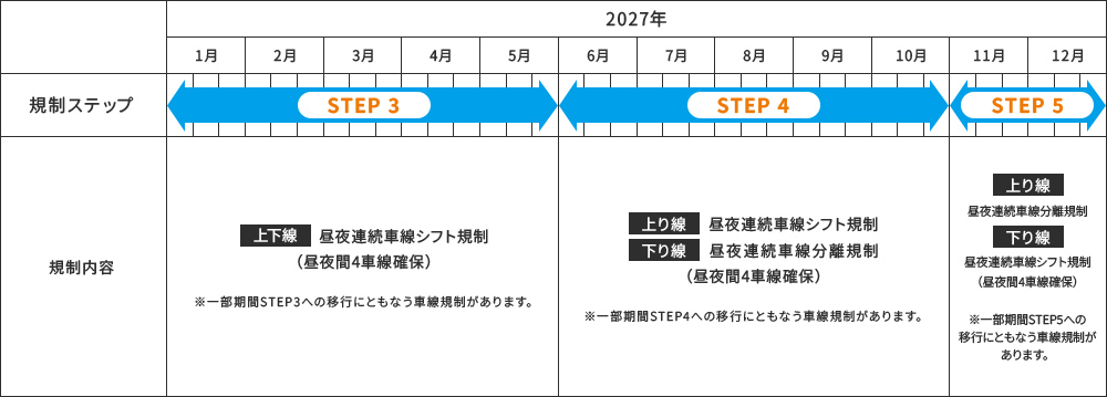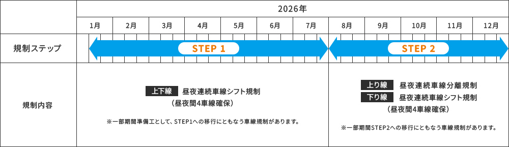 工事する車線の切り替えによって、走行可能な車線数を2車線から1車線へ規制するため、渋滞が予測されますので、