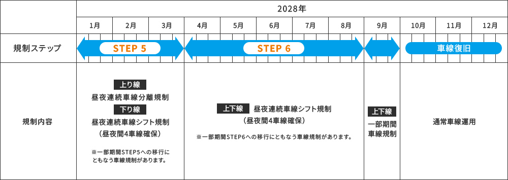1車線ずつ工事をするため、工事をおこなう車線ごとに、大きく6つのステップに分割して施工します。